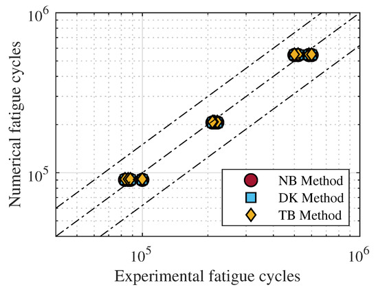 From Figure 11 it is clear as all three spectral methods for fatigue damage estimation supply similar results. The committed errors are comparable to each other. Thus, whichever is the adopted method, the maximum error in fatigue life is lower than 10% at least for the considered cases. To further compare the accuracy of the three adopted spectral methods, a direct comparison between the experimental and numerical obtained fatigue life are depicted in Figure 12.