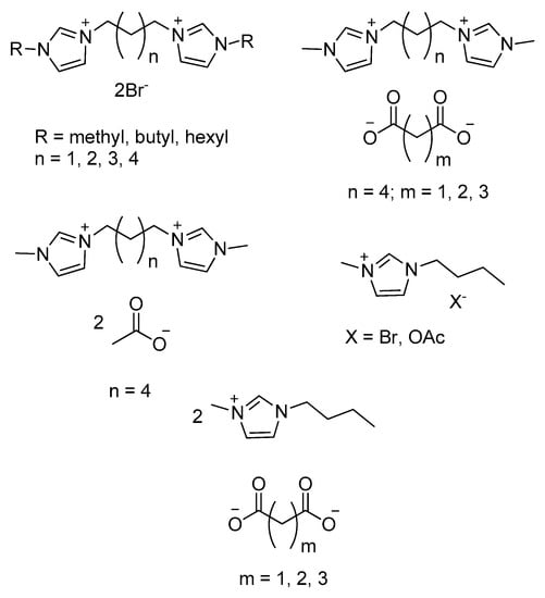 - Al-Mohammed, N.N.; Alias, Y.; Abdullah, Z. Bis-imidazolium and benzimidazolium based gemini-type ionic liquids structure: Synthesis and antibacterial evaluation. RSC Adv. 2015, 5, 92602–92617. [Google Scholar] [CrossRef]