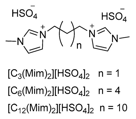 Yang et al. exploited the BrØnsted acidity of imidazolium-based DILs to catalyze the esterification of long-chain free fatty acids with methanol. The authors prepared three different BrØnsted acidic DILs, bearing three ([C3(Mim)2][HSO4]2), six ([C6(Mim)2][HSO4]2) and twelve ([C12(Mim)2][HSO4]2) methylene groups as alkyl spacer chains (Figure 2), to evaluate their catalytic activity in the esterification reaction of oleic acid and methanol.