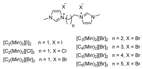 - Sun, Y.-X.; Wang, Y.-Y.; Shen, B.-B.; Zhang, B.-X.; Hu, X.-M. Synthesis and investigation of physico-chemical properties of dicationic ionic liquids. R. Soc. Open Sci. 2018, 5, 181230. [Google Scholar] [CrossRef] [Green Version]