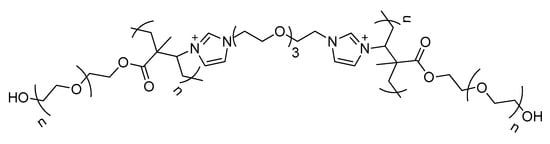 Reddy et al. synthesized an imidazolium-based DIL in which the two cationic heads were linked by tetra-ethylene glycol and the nitrogen contained a polyethylene glycol methacrylate moiety as substituent, the mesylate anions were chosen as counterions (Figure 9) [55].