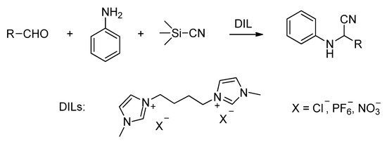 Strecker reaction is one of the best known and investigated multicomponent reactions, which allows the synthesis of α-aminonitrile substrates through one-pot condensation of amine, carbonyl, and nitrile compounds [23]. Verma et al. used for the first time DILs as catalysts in the Strecker synthesis starting from trimethylsilylcyanide (TMSCN), aniline, and differently substituted benzaldehydes (Scheme 1) [24].