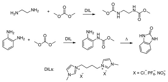 The same authors also reported the application of these DILs as catalysts in the selective synthesis of carbamates, starting from a diamine and using dimethylcarbonate as a carboxylating agent, without solvent [25]. The reaction was performed for the carboxylation of an aliphatic (ethylenediamine) and an aromatic (o-phenylenediamine) amine with dimethyl carbonate (Scheme 2).
