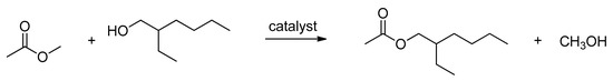 Liu et al. synthesized two novel acidic heteropolyanion-based DILs (DAHPA-ILs) to be applied as catalysts in the transesterification reaction of methyl acetate with isooctyl alcohol (Scheme 4) [33].