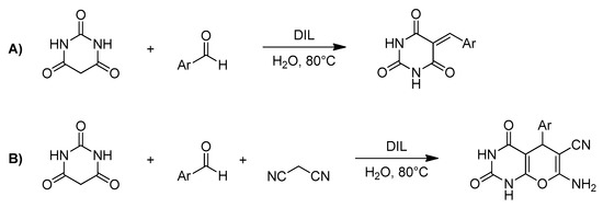 Bronsted acidic DILs catalyzed the synthesis of 5-arylidene barbituric acids (A) and pyrano[2,3-d] pyrimidinone derivatives (B), reproduced with permission from [34].