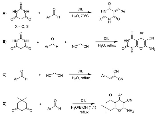 DILs catalyzed of 5-arylidene (thio)barbituric acids (A), pyrano[2,3-d] pyrimidinone derivatives (B), 2-arylidene malononitriles (C), and 4H-pyrans (D), adapted from [35].