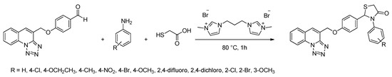 Deshmukh et al. used the DIL [C3(Min)2][Br]2 to catalyze a one-pot cyclocondensation of 4-(tetrazolo[1,5-a]quinolin-4-ylmethoxy)benzaldehyde, anilines, and mercapto acetic acid to obtain 3-substituted phenyl-2-(4-(tetrazolo[1,5-a]quinolin-4-ylmethoxy)phenyl)thiazolidin-4-ones as antitubercular compounds (Scheme 8) [37].