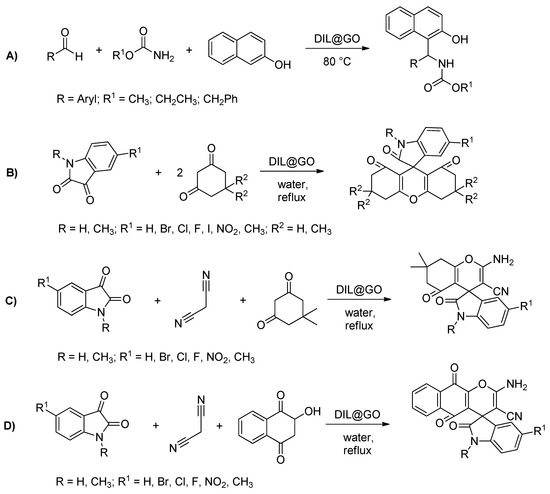 (A) Synthesis of 1-carbamatoalkyl-2-naphthols using DIL@GO; (B) synthesis of spiro[indoline-3, 9′-xanthene]trione derivatives; (C) synthesis of spiro[chromene-4,3′-indoline]-3-carbonitrile derivatives using dimedone; and (D) synthesis of spiro[chromene-4,3′-indoline]-3-carbonitrile derivatives using 2-hydroxynaphthalene-1,4-dione, adapted from [41,42].