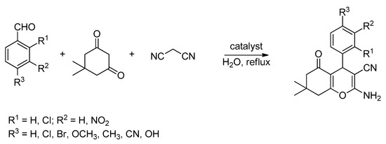Hormozinezhad et al. developed a new imidazolium-based DIL catalyst stabilized on Fe3O4 and SiO2 magnetic nanoparticles with MnCl42− as counterions, describing the synthesis and the morphological and chemical characterizations [43]. The authors tested this catalyst in a one-pot three-component condensation reaction for the synthesis of 4H-chromene derivatives starting from substituted aromatic aldehydes, malononitrile, and dimedone (Scheme 10). After the optimization of the reaction conditions, the best yields (85–92%) were obtained using water as the solvent under reflux in short reaction times (15 min). Moreover, the catalyst was easily reusable by removing it through the application of an external magnetic field.