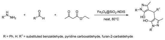 Fe3O4@SiO2-NDIS catalyzed the synthesis of bis-pyrazole-5-ols from various aldehydes, phenylhydrazine/hydrazine hydrate, and ethyl acetoacetate, reproduced with permission from [44].