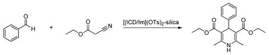 [βCD/Im](OTs)2-silica composite catalyzed the synthesis of diethyl 2,6-dimethyl-4-phenyl-1,4-dihydropyridine-3,5-dicarboxylate starting from benzaldehyde and ethyl 2-cyanoacetate, adapted from [45].