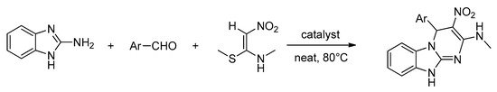 The authors demonstrated the excellent catalytic activity of this DIL in a multicomponent reaction starting from 1H-benzo[d]imidazol-2-amine, (E)-N-methyl-1-(methylthio)-2-nitroethenamine, and a wide selection of aromatic aldehydes for the synthesis of the corresponding N-methyl-2-nitro-aryl-benzo[4,5]imidazo[1,2-a]pyrimidine amines in neat conditions (Scheme 18).