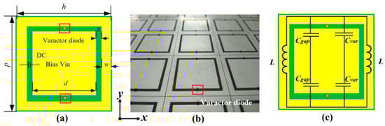 An active metasurface which is capable of electrically tuning the transmitted EM wave phase [31] is utilized to analyze the frequency mixing of spatial electromagnetic waves. The unit cell of the active metasurface and the fabricated metasurface sample are displayed in Figure 1a,b. The unit cell is composed of a central metal patch and a metallic square loop printed on a substrate with a thickness of 1.524 mm, relative dielectric constant of 2.65, and a loss tangent of 0.0017. Two varactor diodes (SMV1405-079LF, Skyworks, Irvine, California, United States) are loaded between two metal areas for electrically tuning the capacitance between them. The geometric parameters are p = 33 mm, h = 32.8 mm, d = 24 mm, g = 1.5 mm and w = 3 mm. The unit cell design is evolved from a square slot FSS design [32] which exhibits a band-pass characteristic. When loaded with voltage-controlled-capacitance diodes, the unit cell can be equaled to an LC circuit as shown in Figure 1c, where for a normally incident wave (y-polarized), L represents the inductance of the metal patch, Cgap represents the capacitance induced by the gap between the inner and outer metal patch, and Cvar represents the capacitance added by the varactor diodes. Therefore, it is possible to intuitively evaluate the relationship between the passband and unit cell parameters, which can be expressed by:
