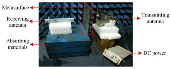 The fabricated metasurface was composed of 80 unit cells arranged in a square lattice. It is noteworthy that a margin of pure metal was designed to suppress the diffraction of the EM wave from the metasurface. The central unit cell was also covered with pure metal for vortex beam generation purposes as described in [31], which, however, posed negligible side-effects to the designed metasurface transmission characteristics. Five separate layers of the structure were stacked vertically with an air gap of 3.5 mm. Foams were inserted between the layers and nylon screws were distributed around the metasurface perimeter to enhance the stability of the metasurface. According to the experiment setup as illustrated in Figure 2, the transmission characteristic of the metasurface was measured from 4 GHz to 6 GHz by a vector network analyzer of Agilent E8363B (Agilent, Santa Clara, California, United States) in a microwave anechoic chamber. A direct current power amplifier PS-305 was used to supply all the varactors on the metasurface with a uniform bias voltage. The measured transmittance was collected, respectively, when the bias voltage increased with a step of 0.5 V from 0 V to 25.5 V.