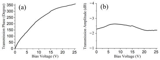 Then the transmission amplitude and phase at 5 GHz were selected from the measured data which is displayed in Figure 3. The transmission phase of the metasurface could be tuned from 0 to 360° with an increasing bias voltage, while the transmission amplitude was between −2.1 dB to −2.7 dB. The transmission loss was inevitably caused by the active varactor diodes on the metasurface which could be further alleviated by using low-loss active components.
