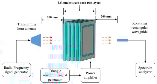 Then the frequency-mixing measurement environment was set up, the block diagram of this is illustrated in Figure 5, which was basically the same as the setup in Figure 2 except for the additional triangle waveform generator. A horn antenna was used to radiate a single-tone 5.0 GHz EM wave onto the metasurface. The transmitted EM wave was received by a WR-229 open-ended rectangular waveguide probe (Hengda Microwave, Xi’an, Shaanxi, China) and its spectrum was acquired by a Rohde & Schwarz spectrum analyzer (Rohde & Schwarz, Muenchen, Germany). The distance between the metasurface to the transmitting horn antenna and the receiving rectangular waveguide were both 200 mm.