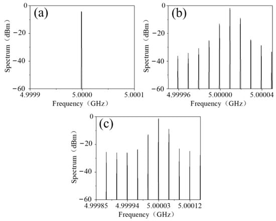 Firstly, no bias voltage was applied to the varactor diodes loaded on the metasurface and the spectrum of the transmitted EM wave exhibited a single-tone 5 GHz as displayed in Figure 6a, indicating that no frequency mixing occurred. Then, the bias signal was set as a 10 kHz upper triangle signal and was further amplified to a maximum of 25.5 V by a high-speed bipolar amplifier. As shown in Figure 6b, the amplitude maximum of the spectrum was at 5.10001 GHz and was 7.3 dB greater than the other higher order harmonics, indicating that the fixing mixing of the spatial EM waves was up to 5.10001 GHz. It is worth explaining that the measured spectrum was sampled at a discrete frequency with an interval of 10 kHz, as opposed to the simulated results; however, the spectrum distribution between the interval was negligible and did not affect the measured results. Similarly, when the bias signal was set as a 30 kHz upper triangle signal, the central frequency of the transmitted EM wave shifted up to 5.10003 GHz as shown in Figure 6c with −7.6 dB maximum harmonics.