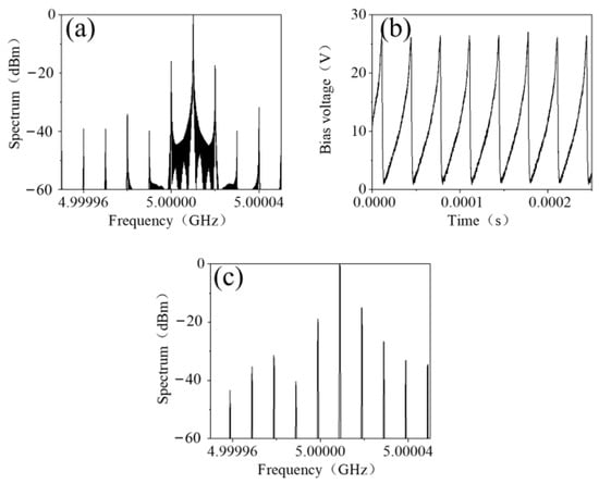 In order to observe the effect of the harmonics’ suppression, the spectrum of the transmitted EM wave was simulated when the bias voltage signal was vb(t) with the frequency f1 of 10 kHz. As shown in Figure 7a, the central frequency shifted up to 5.10001 GHz and the harmonic reduced to −16 dB. Then the waveform of vb(t) was imported to an arbitrary waveform generator RIGOL 3101A and was amplified to 25.5 V, as shown in Figure 7b. The spectrum of the transmitted EM wave was measured and shown in Figure 7c. The central frequency shifted up by 10 kHz and the highest harmonics were −14.1 dB, which is in good agreement with the theory and the simulation result.