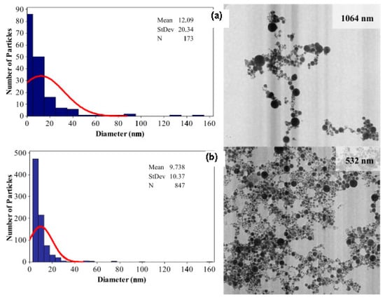Histogram of the size distribution on TEM images of the gold nanoparticles produced by (a) 1064 nm and (b) 532 nm in distilled water (retrieved with permission from reference []).