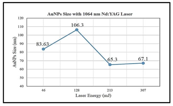 A study shows that higher laser energy at 318 mJ will produce smaller average particle sizes of gold nanoparticle (7.516 nm) than that at 286, 226 and 96.6 mJ with particle sizes at 17.5, 25 and 30 nm, respectively, with the same 1064 nm laser ablation wavelength []. However, this is in disagreement with a study performed by Jamaludin et al. [] as shown in Figure 2.