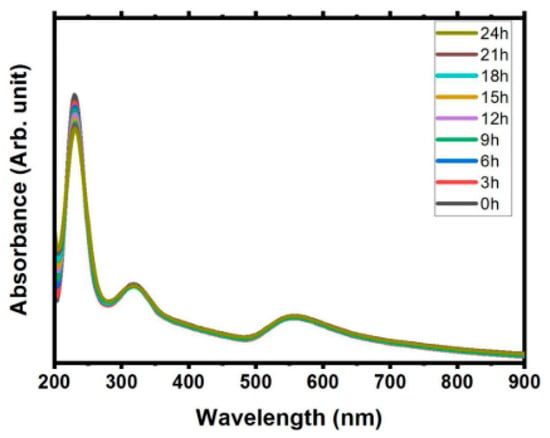 In addition, the SPR absorbance value does not bring significant changes over the time in stabile solution. Figure 3 shows small shifted in wavelength, with decrease the value of absorbance amplitude recorded as time passed for 24 h []. This study also has shown minimal decreased in Zeta potential value, that indicates the good stability solution. Moreover, the SPR determines the visible colour based on the concentration and size of synthesised gold nanoparticles [].]. The SPR wavelength increases with the particle size and shape and corresponds to the colour of the gold nanoparticle produced. The gold nanoparticle size in a range of 10–20 nm showed red colour, and it changed to blue and purple with the increment of their size [].