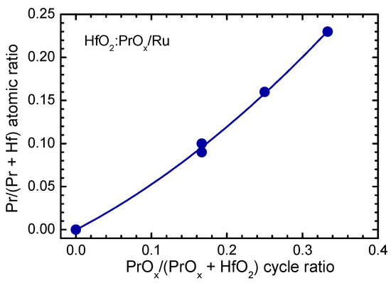Pr/(Hf + Pr) atomic ratio as a function of PrOx/(HfO2 + PrOx) cycle ratio, used for ALD of HfO2:PrOx films.