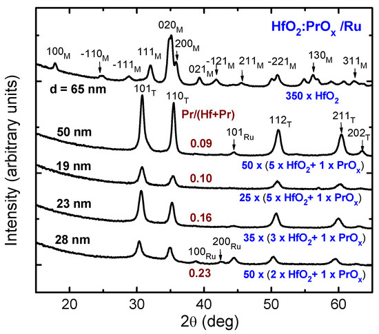 Grazing incidence diffraction patterns from HfO2:PrOx films deposited on Ru. The growth cycle sequences for HfO2 and PrOx, and Miller indexes attributed to either tetragonal (T) or monoclinic (M) phases of HfO2 are shown at the diffraction patterns. Reflections from substrate Ru layers are denoted by corresponding labels. The film thicknesses (d) and compositions (Pr/(Hf + Pr) atomic ratios) are also indicated by labels.