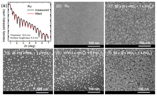 (a) XRR pattern on bare Ru bottom electrode, and (b–f) SEM images of (b) bare Ru bottom electrode, and (c–f) surfaces of HfO2:PrOx films deposited using cycle sequences indicated by labels.