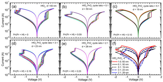 Current voltage envelope curves describing resistive switching of HfO2:PrOx films as-deposited on Ru electrode substrates. HfO2:PrOx deposition cycle ratios, Pr/(Pr + Hf) atomic ratios, and film thicknesses are indicated by labels in panels (a–e), where multiple (6–20) current–voltage curves are presented for the same film and device, measured consecutively and presented in different colors to enable better distinction. In panel (f), the averaged current–voltage curves are depicted comparatively.