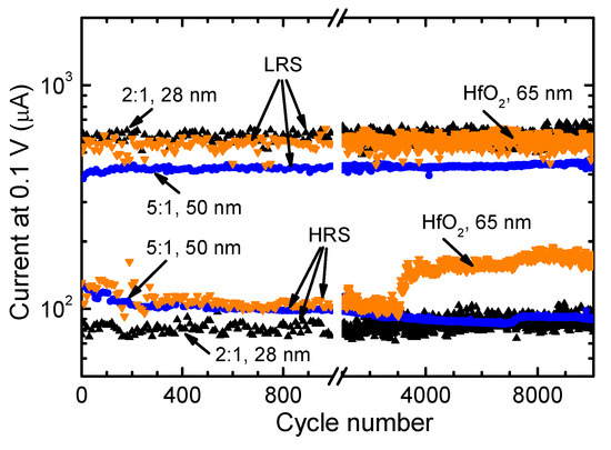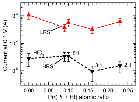 Current values recorded in low resistance state (LRS) and high resistance state (HRS) at a voltage value of 0.1 V (see Figure 5). The HfO2:PrOx ALD cycle ratios are indicated by labels at corresponding data points.