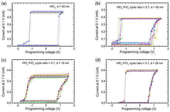 Current recorded at 0.1 V as a function of programming voltage used for biasing of the (a) HfO2 and (b–d) HfO2:PrOx media before the current measurement. The HfO2:PrOx cycle ratios used for growing the films and film thicknesses are indicated by labels. Different colors correspond to different memory maps recorded for the same film and device. The Pr/(Pr + Hf) atomic ratios were (b) 0.09, (c) 0.10, and (d) 0.23.