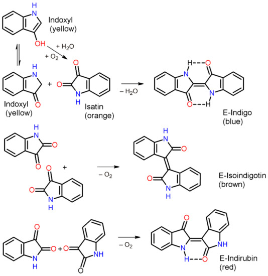In the synthesis from plant sap, indoxyl reacts with oxygen and water to form the three isomers indigo blue (indigo), indigo brown (isoindigotin), and indigo red (indirubin), which were already described in plant extracts by Jöns Jakob Berzelius (1779–1848). The chemical synthesis starts from the same reactants and forms the same isomers, whose relative content may change according to the reaction conditions. Both natural and synthetic indigo are built up from the starting substance indoxyl. Thus, in addition to indigo, the isomers isoindigotin and indirubin are formed in both processes (Figure 1).