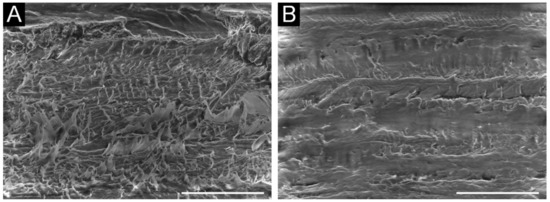 Scanning electron microscopy images showing the roughened surface of the ultra-high-molecular-weight polyethylene (UHMWPE) base before (A) and after coating with E-indigo (B). The scale bar is 100 µm (52° tilt view) [68].