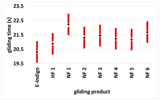 Running times over a measuring section for different ski gliding layers. Tests with calibrated cross-country skis (Lenzerheide, Switzerland, October 2020). The data points show the mean values with the 95% scatter bars. Snow temperature: −8 °C; air humidity: 75%; dry, old snow, grain size 0.5–0.8 mm, star-shaped grains, no dirt (HF: high fluor wax; NF: non-fluorinated wax) [70].