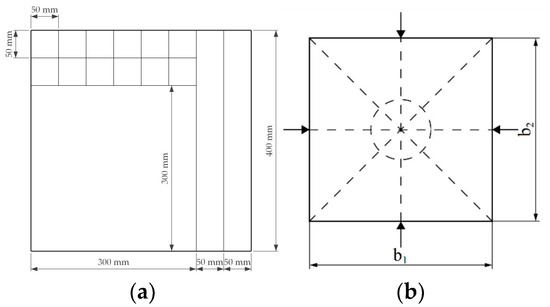 Board samples were manufactured using cold-pressing technology into 200 mm × 200 mm and 400 mm × 400 mm size. Samples were prepared using 266 g hemp shives and a 10 wt.% UF binder for the small pieces and four times the amount for the large ones. Every part of the mixture components was weighed on a scale. Firstly, water was poured into the dry binder and mixed into a homogenous mixture. The stirring was performed for 300 s to obtain a homogenous consistency. Secondly, it was gradually added to the shives while simultaneously mixed with an electric mixer for another 300 s. Hemp shive and binder mixture was formed by hand in the pre-made template (Figure 2a). The template and punch form were immersed in a hydraulic press (Figure 2b) and pressed for 24 h at 21 ± 1 °C under 0.72 MPa pressure for large samples and 2.86 MPa pressure for small ones.
