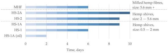 Hemp (Cannabis sativa L.) was grown at the experimental plot of the Agriculture Science Centre of Latgale in Vilani, Latvia, in 2017 [52]. The Polish variety Bialobrzeskie (owner: Institute of Natural Fibres & Medicinal Plants, Poznan, Poland) has been chosen for the experimental part because it is the most common variety of hemp cultivated on eastern Europe plantations [53]. The original particle size distribution of the hemp shives was rather wide (0.063–15 mm), and it contained fine dust particles originating from the manufacturing disintegration process. This material consisted of a large majority of hemp shives and a small amount of hemp bast fibers. The average moisture content of the hemp material was determined by weighing the hemp samples before and after drying them for 24 h at 105 °C according to LVS EN 322 standard and then calculating (Equation (1)) [54].