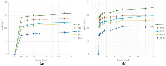 Most water absorption occurs during the first 5 min of material immersion. After 15 min the board samples without shives pre-treatment and particles size range 0.5–2 mm (HS-1) increased 2.9 times (Figure 6a). Samples with additives (HS-1A, HS-2A) after the same time increased their mass only 2 and 1.4 times, respectively (Figure 6a). After 8–12 h of immersion, the weight gain of samples slows down and later increases gradually (Figure 6b) but does not stop until they start to sink in the soaking container (5–6 days) or totally decay. At the last comparable data point—144 h of soaking in water, the most increase in mass is for HS-1 samples—390%, the least for HS-2A—272%.