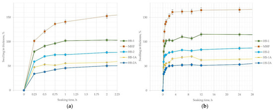 Water absorption—swelling in thickness of hemp board samples: (a) thickness swelling for 2 h; (b) thickness swelling for 24 h.