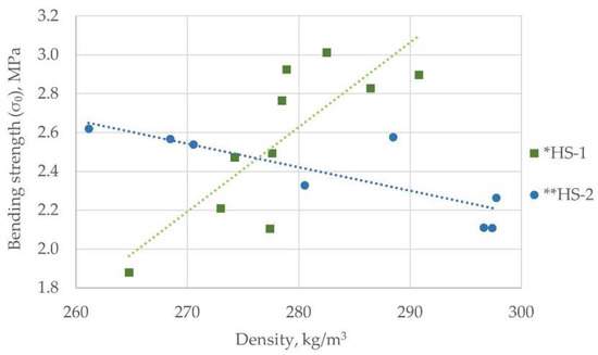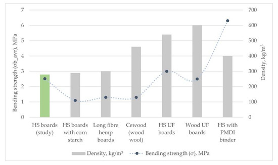 The bending strength results are close to expectations raised by similar research where UF is used as the binder. In comparison with similar materials (Figure 9), the experimental board average bending strength value is higher than for materials with the same filler, similar density but different binder used [45,63], but is lesser or similar to materials with the higher density [21,33]. There are too many variables, such as the amount and type of binder, particle size, thickness, pressing conditions, and more, to make direct conclusions. Result similarity to denser compositions could be explained by the removal of finer particles (smaller than 0.5 mm) during the material processing step, although another batch of samples with these finer particles included in the study should be produced. To match denser materials such as wood particle boards, wood chipboards, and medium density fiberboards, the bending strength values still need to be improved.