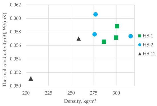 The differences in the conductivity values seen in Figure 10 have originated mainly from the particle size range and binder distribution. In compared materials, the type of binders used was formaldehyde resin glue. It seems that thermal conductivity disperses heavily if the range of particle sizes is too wide (Figure 10, black triangles), which suggests an unstable board structure. In this research, the particles smaller than 0.5 mm were removed to both improve the binding process and leave clear air pockets, which are important to slow down the transfer of heat flow. In future research, hemp shives board samples that have the same particle size ranges but different binders must be produced to determine specific influence. In comparison with other hemp shives and wood chipboard materials with similar density (Figure 11), experimental samples have a lower thermal conductivity.