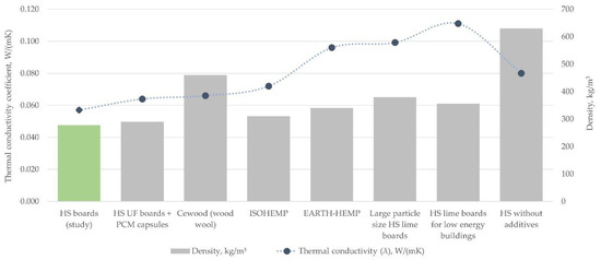Hemp has been confirmed as a great filler material in composites for thermal insulation, which is further improved if shives are added to the composite as filler [46]. Hemp shives used as the main ingredient can produce materials with great insulation properties. In previous research, the thermal conductivity values are in the range from 0.064 W/(mK) to 0.074 W/(mK) for hemp shive boards with UF binders or wood fiberboards [47,48]. For hemp shive boards already on the market, the given reference values are in the range from 0.072 W/(mK) to 0.094 W/(mK) [49,50]. In comparison, the most commonly used thermal insulation materials in the construction industry, such as rock wool, glass wool, and phenolic foam, have thermal conductivity values in the range from 0.018 W/(mK) to 0.040 W/(mK) [51].