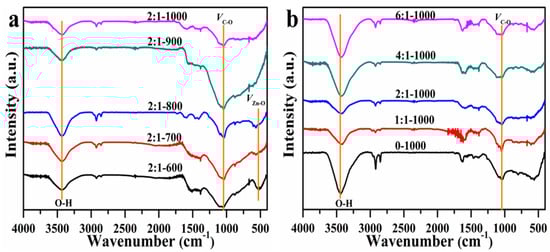 FT-IR curves of different AC adsorbents synthesized with various carbonization temperatures (a) and mass ratios (b).