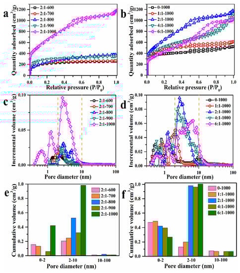 (a) N2 adsorption–desorption isotherms of various AC adsorbents prepared with different carbonization temperatures and (b) mass ratios; (c) pore size distribution of various AC adsorbents prepared with different carbonization temperatures and (d) mass ratios; (e) pore volume distribution of various AC adsorbents prepared with different carbonization temperatures and (f) mass ratios.