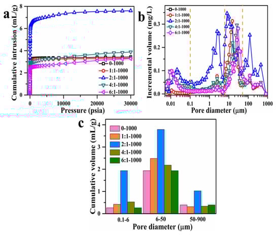 The variation of cumulative intrusion with pressure (a), macropore distribution (b), and pore volume distribution (c) of AC adsorbents from 0-1000 to 6:1-1000 with different mass ratios at 1000 °C.