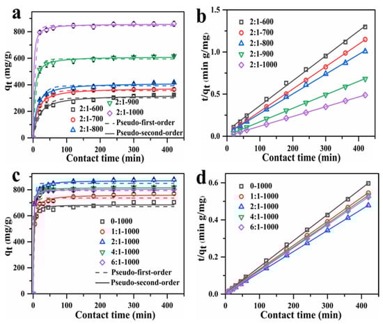 The adsorption behavior of all AC adsorbents towards MB in aqueous solution, synthesized at different temperatures and mass ratios, was thoroughly investigated. Figure 6a,c show the effects of contact time on the adsorption of all AC adsorbents toward MB. The adsorption quantity increased with contact time, and all samples reached equilibrium when the contact time surpassed 120 min. However, the adsorption rate increased with carbonization temperature, indicating that the carbonization temperature had an effect on the adsorption property.
