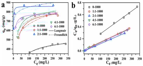where qe (mg/g) and qm (mg/g) are the equilibrium and maximum adsorption quantity, Ce (mg/L) is the concentration at equilibrium time, KL (L/mg) and KF are the Langmuir and Freundlich adsorption constants, respectively, and n is the adsorption intensity.