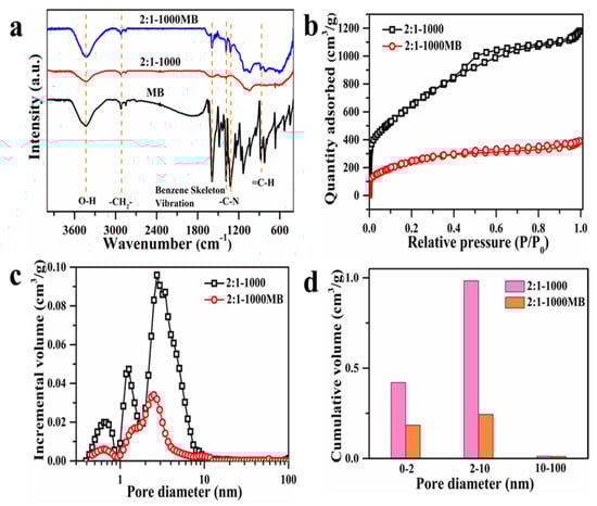 (a) FT-IR spectra of MB and 2:1-1000 AC adsorbent before and after the adsorption of MB; (b) N2 adsorption–desorption isotherm of 2:1-1000 AC adsorbent before and after MB adsorption; (c) pore size distribution of 2:1-1000 AC adsorbent before and after the adsorption of MB; (d) pore volume distribution of 2:1-1000 AC adsorbent before and after MB adsorption.