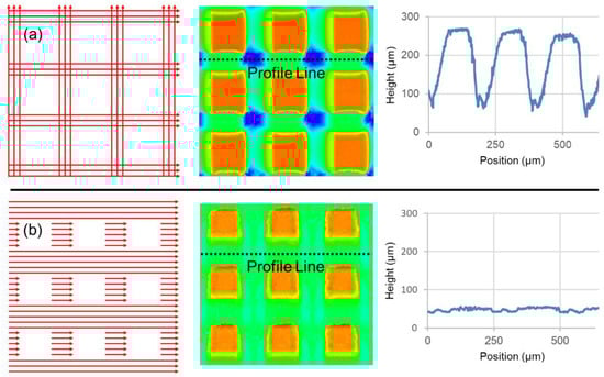 Without an effective shuttering system, laser texturing applications are severely limited. For example, as shown in Figure 1a, it is possible to micromachine an array of square pillars without a shutter, whereas long, overlapping lines can be intersected in the x- and y-directions, producing a grid. However, as demonstrated by the topographical heat map and corresponding cross-sectional profile line, this method of generating surface textures causes some portions of the surface to receive twice the amount of laser pulses. The unavoidable side effect of this approach is the creation of some areas which are deeper than others along with differing local surface chemistries. This problem of overlapping fluence profiles with uncontrolled depth has been witnessed in numerous applications, e.g., wettability studies on ablated gridlike structures [12,13] and dynamic studies concerning the influence of micromachining on droplet mobility and splashing [14,15].