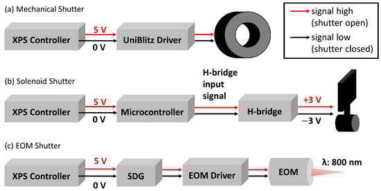 Box chart visualizing the signal pathway for each shutter. (a) Mechanical shutter. (b) Solenoid Shutter. (c) EOM shutter.