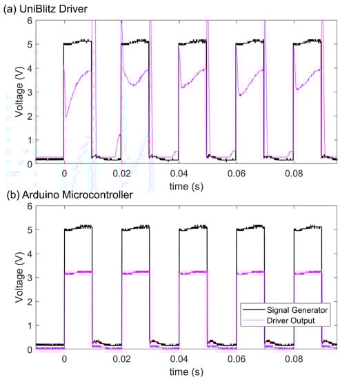 We began our work with tests of possible delays introduced by the electronic control equipment in the signal pathway. That is, we took simultaneous oscilloscope readings of the XPS controller TTL signal and the signal sent forth by the UniBlitz driver or Arduino microcontroller, with a temporal resolution of 0.04 ms. As shown in Figure 4, neither the commercial mechanical shutter driver nor the microcontroller we programmed ourselves to activate the H-bridge introduce any measurable delay in the electrical signaling of their respective shutters. There is no offset in the square high/low TTL signal and the respective square high/low shutter driver signals. These findings tell us that any deviation from ideal shutter behavior will be the result of mechanical—not electrical—limitations of the systems.
